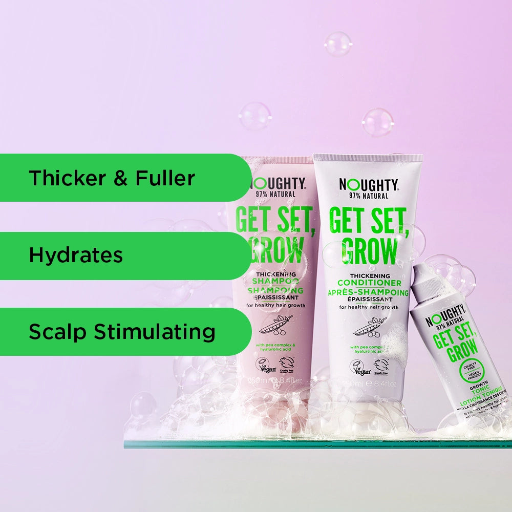 Erhalten Sie in nur 12 Wochen sichtbar dickeres, volleres Haar!* Get Set, Grow Thickening Starter Bundle! Formuliert mit Noughtys Pea Complex. Natürlich, sulfatfrei, silikonfrei, parabenfrei. Vegan und frei von Tierversuchen.